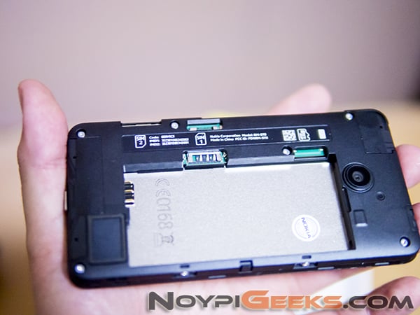 Removing the polycarbonate shell (it even has an instruction sticker that shows you how to do that – yey!) grants you access to the long battery stick, the microSD port, and the two microSIM ports. Curiously, SIM2 is hot-swappable as you don’t need to remove the battery to gain access to the port. It would’ve been nice if they were all hot-swappable, but it’s a non-issue. The top of the Lumia 630 has the 3.5mm jack for your earphones and such, and the bottom has the microUSB port.