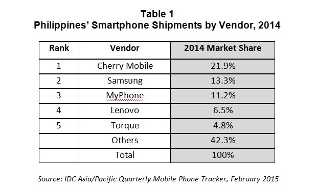 According to IDC’s Asia/Pacific Quarterly Mobile Phone Tracker, Cherry Mobile’s products accounted for 21.9 percent of smartphone shipments in 2014. This was followed by Samsung by 13.3 percent. MyPhone and Lenovo came in third with 11.2 percent and fourth with 6.5 percent, respectively. Torque was the third top local vendor and fifth overall at 4.8 percent. LG placed second among global vendors, but it failed to make it to the top five.